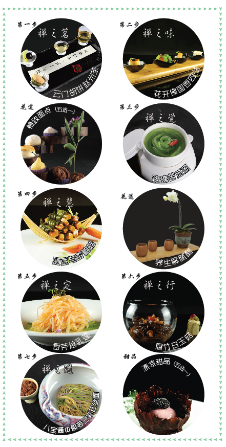 117元套餐素食是非常講究色、香、味、形、器的,只有真正愛(ài)上素食、懂得素食的人,才能品嘗出其中的美妙。本季伊始,禪素特別推出超值117元套餐。旨在讓更多的素食愛(ài)好者感受禪素的魅力。本套菜單融會(huì)了廚藝大師對(duì)素齋多年的研發(fā)心得,摘鮮、提味、擺型、配搭、境意等多元化打造菜品,是素齋,更是藝術(shù)品。