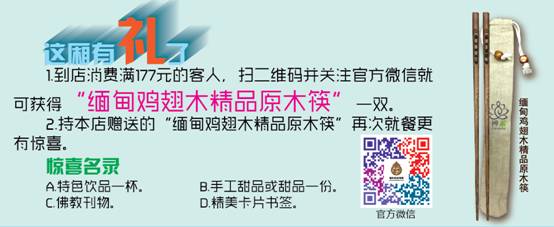 1.到店消費(fèi)滿177元的客人,掃二維碼并關(guān)注官方微信就可獲得“緬甸雞翅木精品原木筷”一雙。