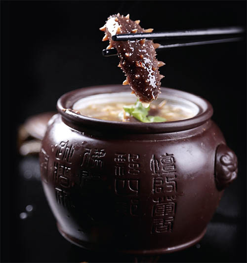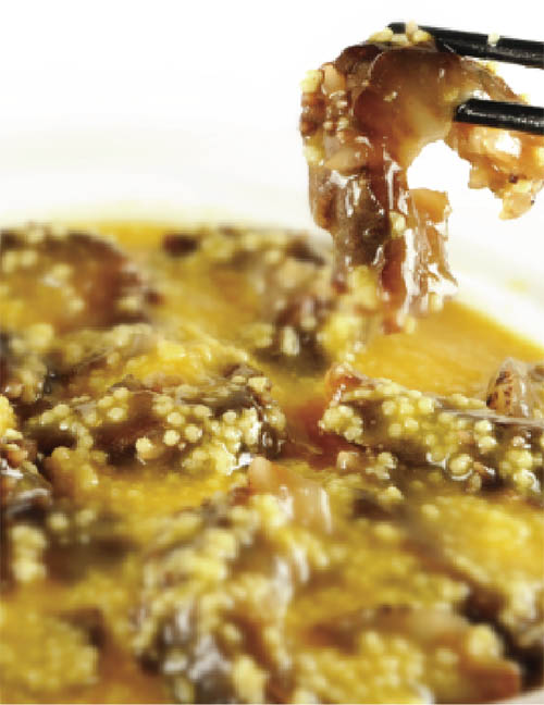 慢火小米煮參皇:《本草綱目拾遺》中記載:海參,味甘咸,補(bǔ)腎,益精髓。具有補(bǔ)腎益精、滋陰健陽(yáng),補(bǔ)血潤(rùn)燥、調(diào)經(jīng)祛勞、養(yǎng)胎利產(chǎn)等陰陽(yáng)雙補(bǔ)功效。這道菜選用膠東深海無(wú)污染的質(zhì)優(yōu)海參,口感爽滑細(xì)膩,配以優(yōu)質(zhì)小米,口味鮮香,營(yíng)養(yǎng)豐富,是秋季補(bǔ)身之上品。