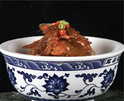 老醋蟄頭:海蜇頭具有補(bǔ)心益肺、滋陰化痰的功效,這道菜精選上等渤海灣清蟄頭,與津門名醋精心配比,口感爽脆,酸香適中。
