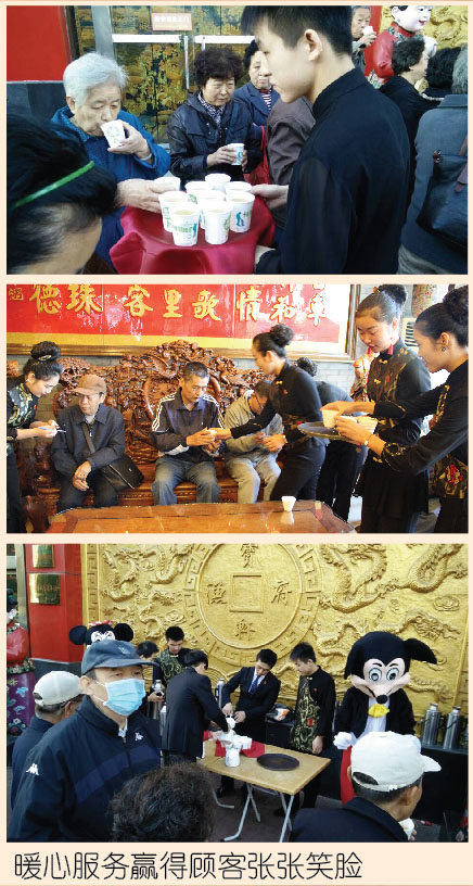 因為當天早上的氣溫較低,各家門店不約而同地為排隊的顧客奉上熱茶,驅(qū)散寒意,還準備了舒適寬敞的休息區(qū),細心而周到的服務,帶走了排隊等號客人的疲累和困倦,贏來的是在場每位顧客滿意的笑容。