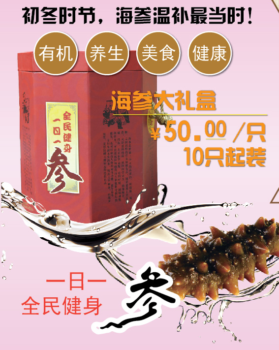 海參同人參、燕窩、魚(yú)翅齊名,是世界八大珍品之一。不僅是珍貴的食品,也是名貴的藥材,有提高記憶力、延緩性腺衰老,防止動(dòng)脈硬化以及抗腫瘤等作用。