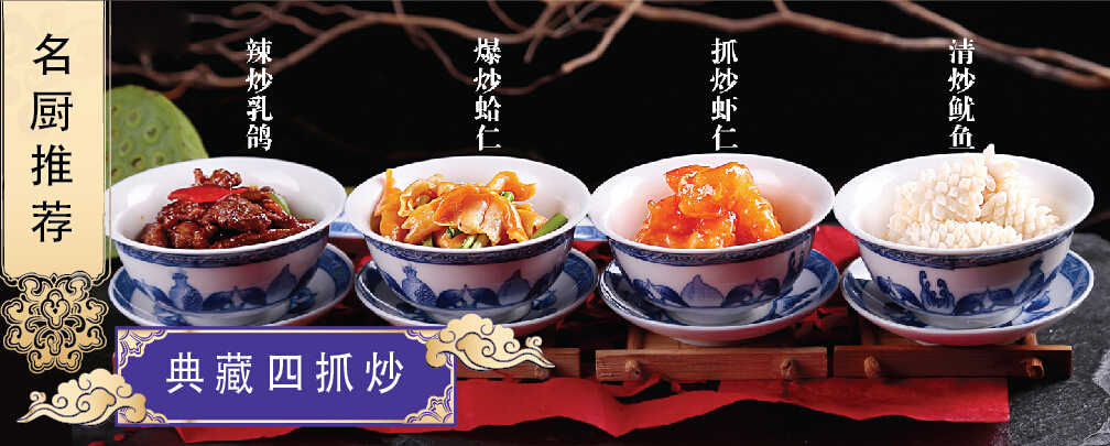 典藏四抓炒分別是:辣炒乳鴿 爆炒蛤仁 抓炒蝦仁 清炒魷魚