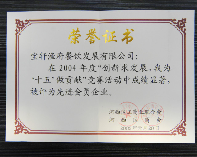 “寶軒漁府餐飲發(fā)展有限公司2004年度被評為先進會員企業(yè)”榮譽證書 發(fā)布日期:2013-07-06所屬欄目:資質(zhì)榮譽 “寶軒漁府餐飲發(fā)展有限公司2004年度被評為先進會員企業(yè)”榮譽證書