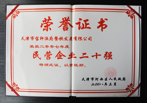 天津市寶軒漁府餐飲發(fā)展有限公司 榮獲2007年度 民營(yíng)企業(yè)二十強(qiáng)“榮譽(yù)證書(shū) 發(fā)布日期:2013-08-02所屬欄目:資質(zhì)榮譽(yù) 天津市寶軒漁府餐飲發(fā)展有限公司 榮獲2007年度 民營(yíng)企業(yè)二十強(qiáng)“榮譽(yù)證書(shū)