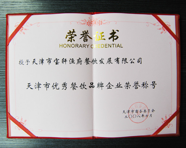“授予 天津市寶軒漁府餐飲發(fā)展有限公司 天津市優(yōu)秀餐飲品牌企業(yè)榮譽(yù)稱(chēng)號(hào)”榮譽(yù)證書(shū) 發(fā)布日期:2013-08-02所屬欄目:資質(zhì)榮譽(yù) “授予 天津市寶軒漁府餐飲發(fā)展有限公司 天津市優(yōu)秀餐飲品牌企業(yè)榮譽(yù)稱(chēng)號(hào)”榮譽(yù)證書(shū)