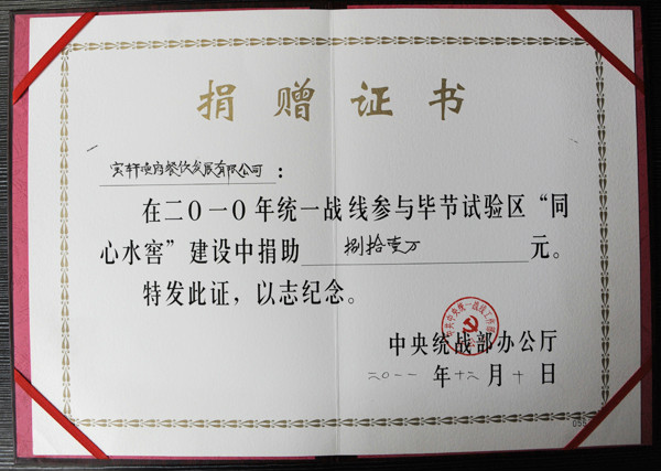 “寶軒漁府餐飲發(fā)展有限公司‘同心水窖’建設(shè)中捐助81萬元”捐贈證書 發(fā)布日期:2013-08-02所屬欄目:資質(zhì)榮譽 “寶軒漁府餐飲發(fā)展有限公司‘同心水窖’建設(shè)中捐助81萬元”捐贈證書